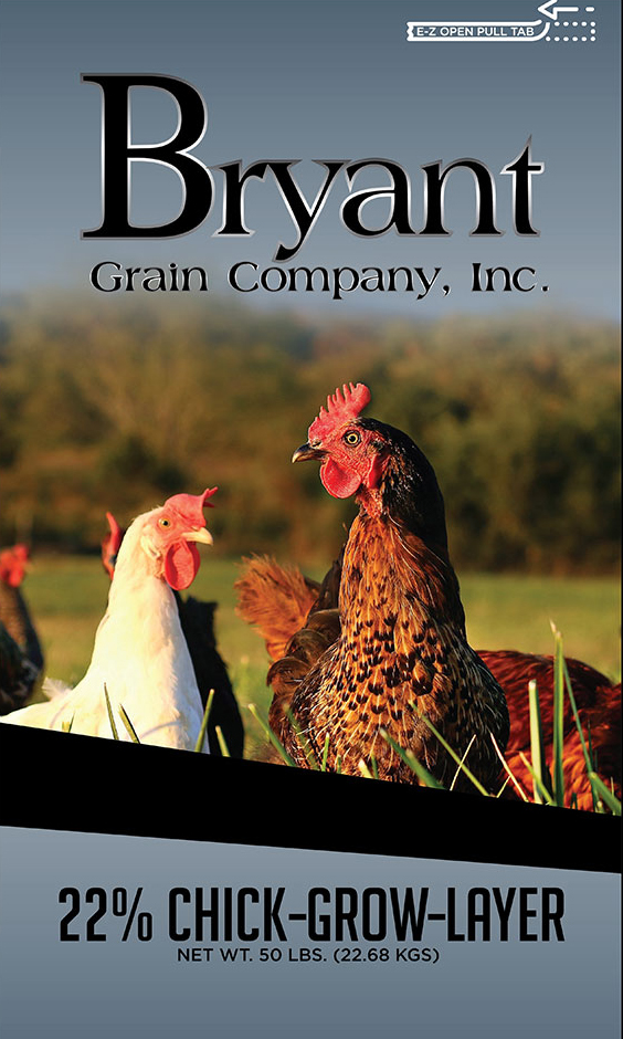 Bryant Grain’s 22% ChicK-Grow-Layer is 22% protein ration designed for poultry from hatch to egg production. It is a blend of high quality grains and all natural vegetable protein to promote optimum egg production. Crumble form for birds that prefer small feed particles.