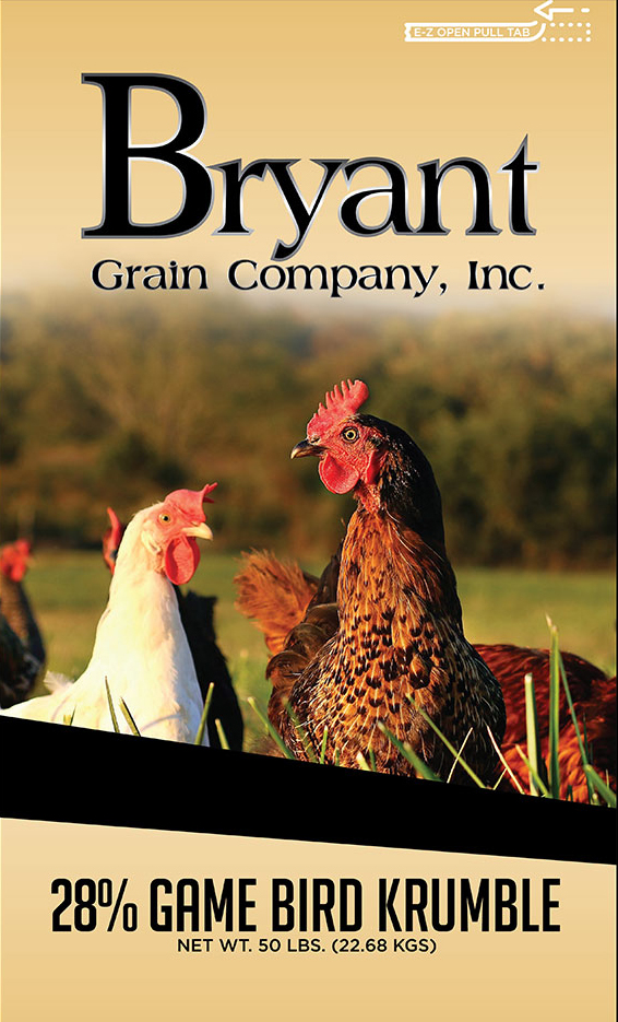 Bryant Grain’s 28% Game Bird Krumble is a 28% protein, high quality ration designed for many different species of game birds. It is a blend of high quality grains and all natural vegetable protein to promote optimum egg production. Crumble form for birds that prefer small feed particles.